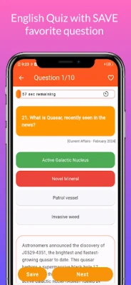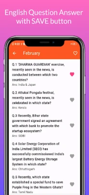* Favorite: tap on the heart ♥ shape to create a separate list of your favorite question to revise it later. In Quiz you have to click on SAVE button for the same functionality.