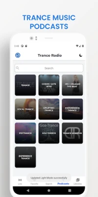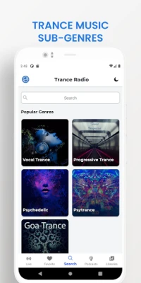All radio stations are sorted by the following genres: Vocal Trance, Progressive, Psychedelic, Psytrance, Goa.